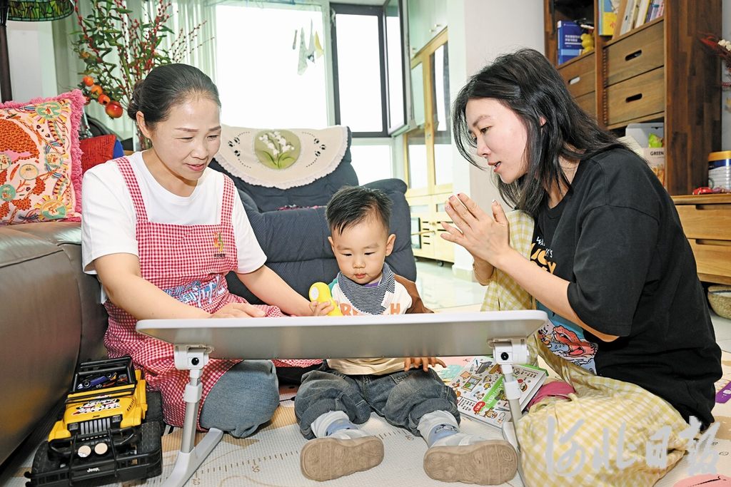 “河北福嫂”盖立平(左一)在北京雇主家中照看宝宝。(河北日报资料片)