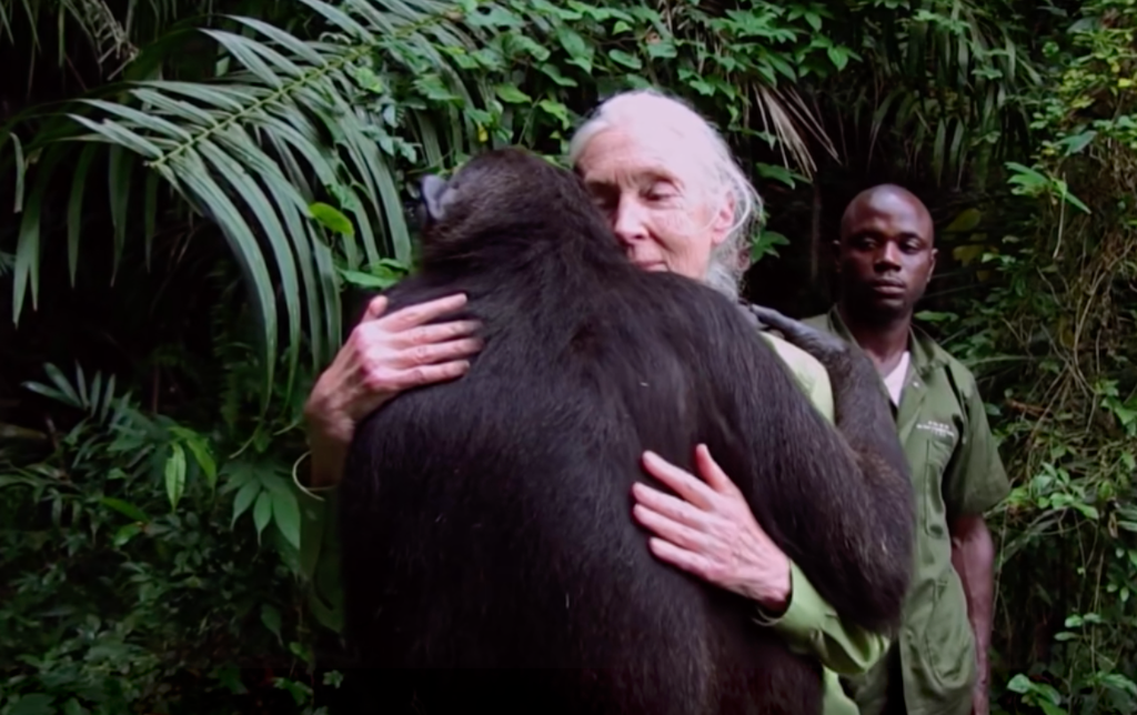 △被救助的黑猩猩在放归前拥抱珍·古道尔