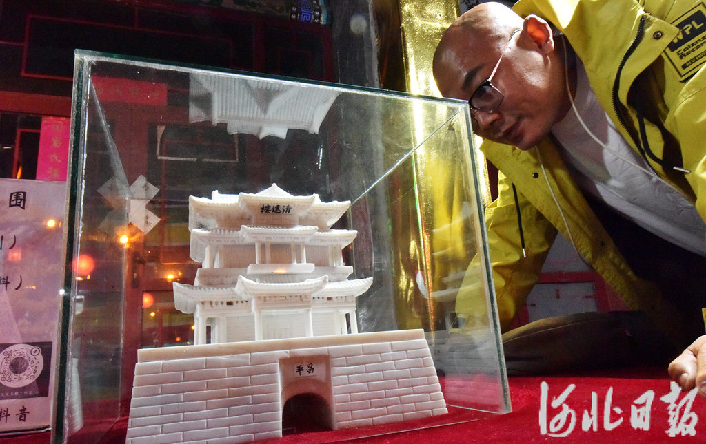一名游客被一件缩微版清远楼玉雕吸引。陈晓东摄