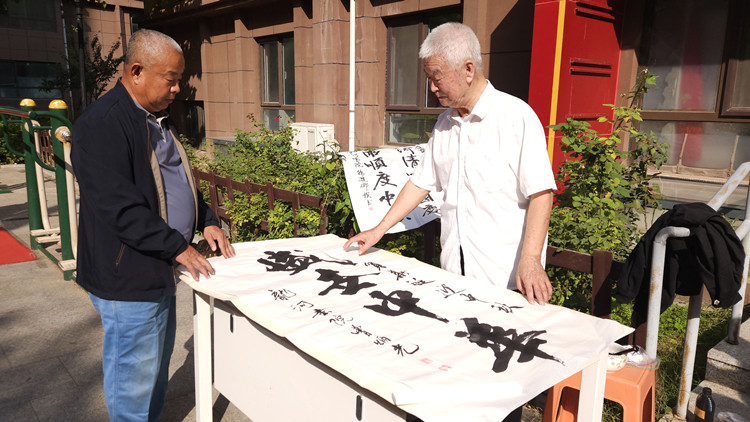 近日,北史家务镇瑞景嘉园社区举办“家国同庆双节至,艺满社区暖人心”主题文艺演出。图为书法展示环节。