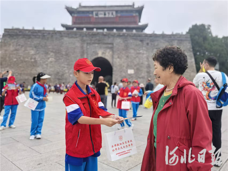 活动现场,南园小学的20名“红领巾”法律援助宣传员向游客介绍法律援助相关知识,并发放法律援助法、河北省法律援助条例、法律援助便民联系卡等宣传品。