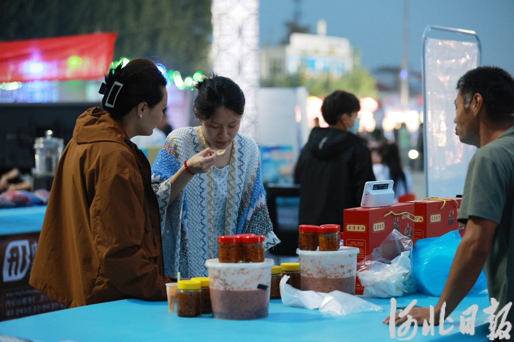 10月1日,游客在内丘县中医药文化夜市上品尝美食。刘继东摄
