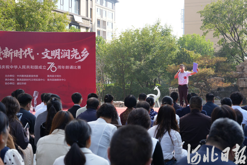 河北日报客户端讯(潘志方、郭泽鑫)9月29日,一场以“礼赞新时代 文明润尧乡”迎国庆为主题的朗诵比赛在河北隆尧县盛钰华府小区拉开帷幕,吸引了众多市民与朗诵爱好者的热情参与。