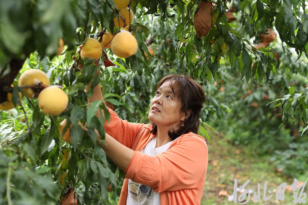 10月4日,游客在复兴区户村镇大滋然生态农场内采摘黄桃。河北日报见习记者 冯依凡摄