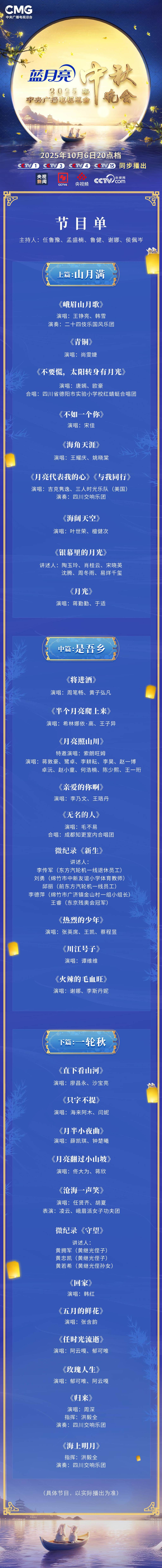 清辉盈古蜀,灯火映华夏。《中央广播电视总台2025年中秋晚会》节目单发布。晚会依托四川德阳的实景山水,通过《山月满》《是吾乡》《一轮秋》三个篇章30余个节目,营造出月映山河、情满人间的隽永意境。