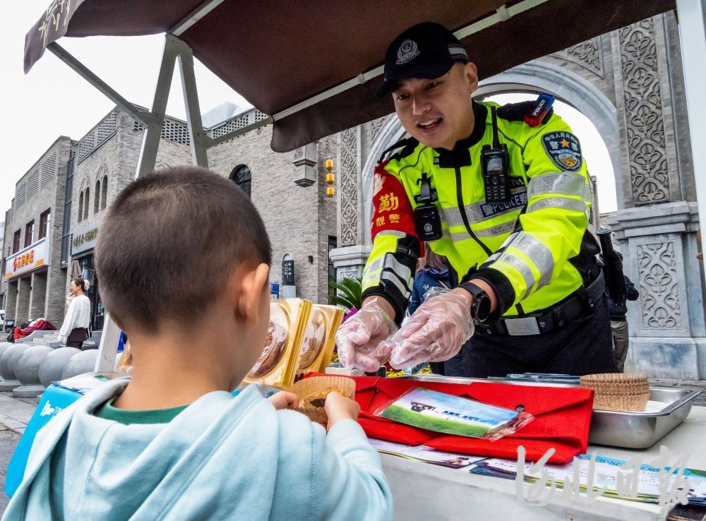 10月6日,保定市公安交警在西大街向游客赠送印有交通安全提示语的平安月饼,共庆中秋佳节。河北日报记者许佳奇摄