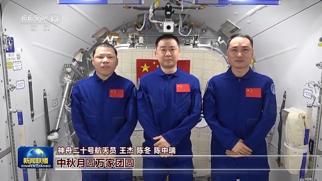 神舟二十号航天员 王杰 陈冬 陈中瑞:我们虽然身处茫茫太空,无法与家人团聚,但我们的心却始终与祖国和人民紧紧联系在一起,始终跟家人们紧紧联系在一起。我们在中国空间站祝大家中秋快乐!