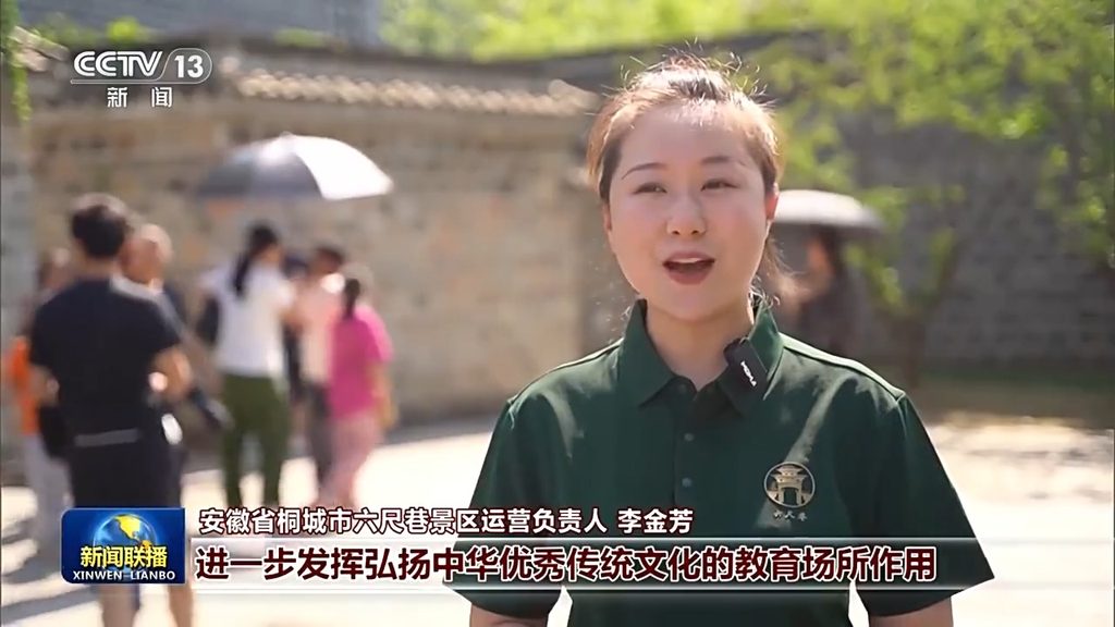 安徽省桐城市六尺巷景区运营负责人 李金芳:我们落实习近平总书记的要求,进一步发挥好弘扬中华优秀传统文化的教育场所作用,让游客能够自然而然感悟“谦和礼让”的家风,了解中华民族的文化基因和精神追求。