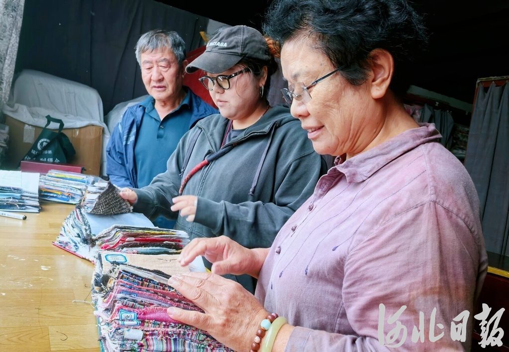 9月19日,赞皇原村土布纺织技艺第三代传承人崔雪琴(右一)和第四代传承人仇莎(右二),与合作社工作人员一起研究新研发的布料。河北日报记者蔡晓辉摄