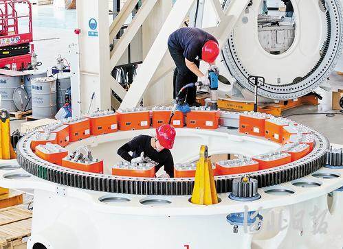 日前,在邯郸冀南新区河北运达风电设备有限公司生产车间内,工人在组装风电机组偏航系统。周景泽摄