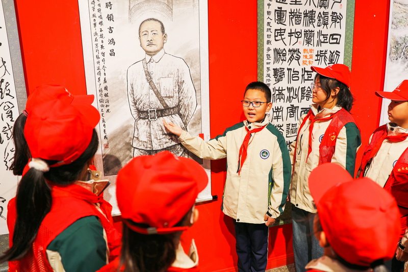10月11日,张家口市桥东区宝丰街小学学生在介绍爱国拥军书画展作品。