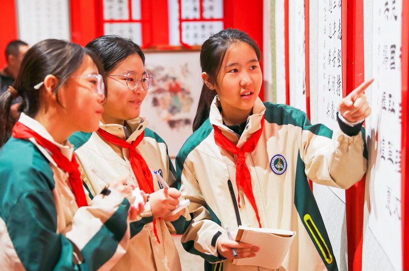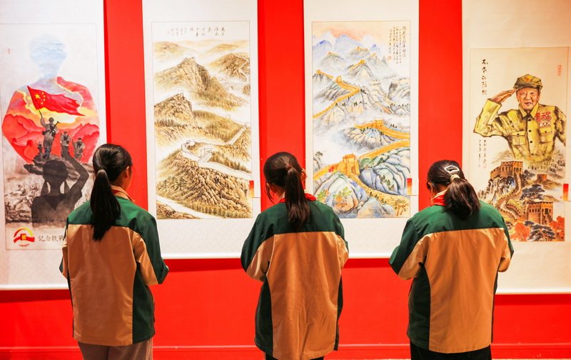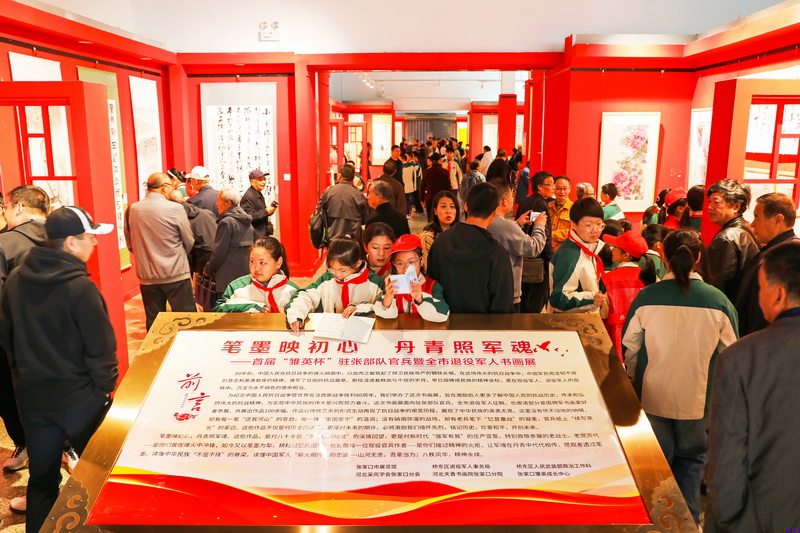 10月11日,张家口市桥东区宝丰街小学学生在参观爱国拥军书画展。