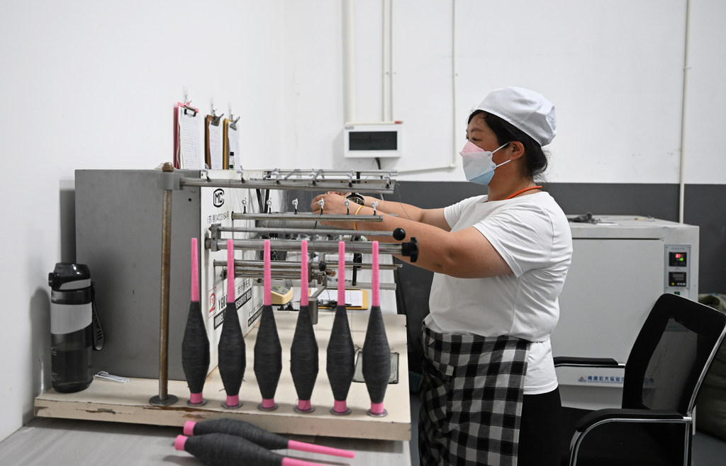 9月28日,河北万沛羊绒制品有限公司员工在检验纱线质量。