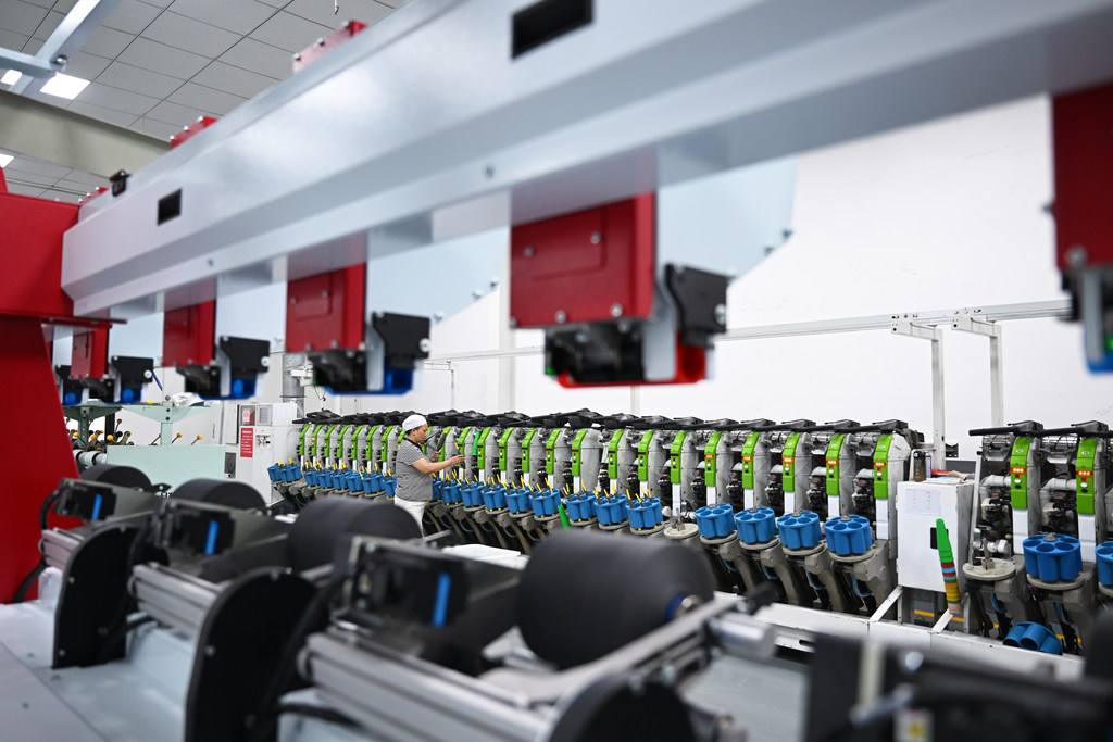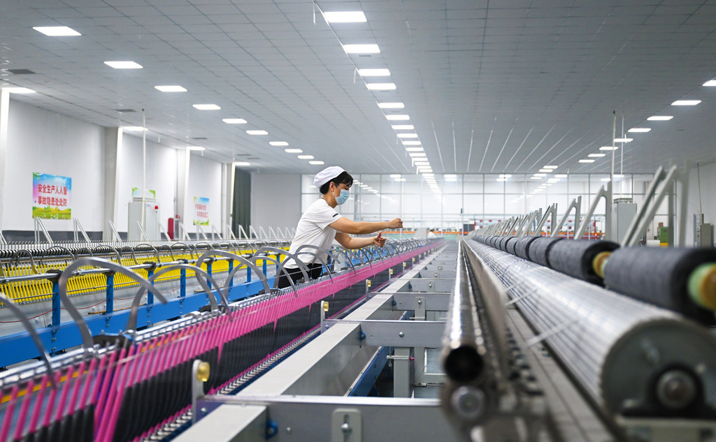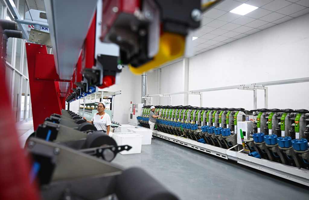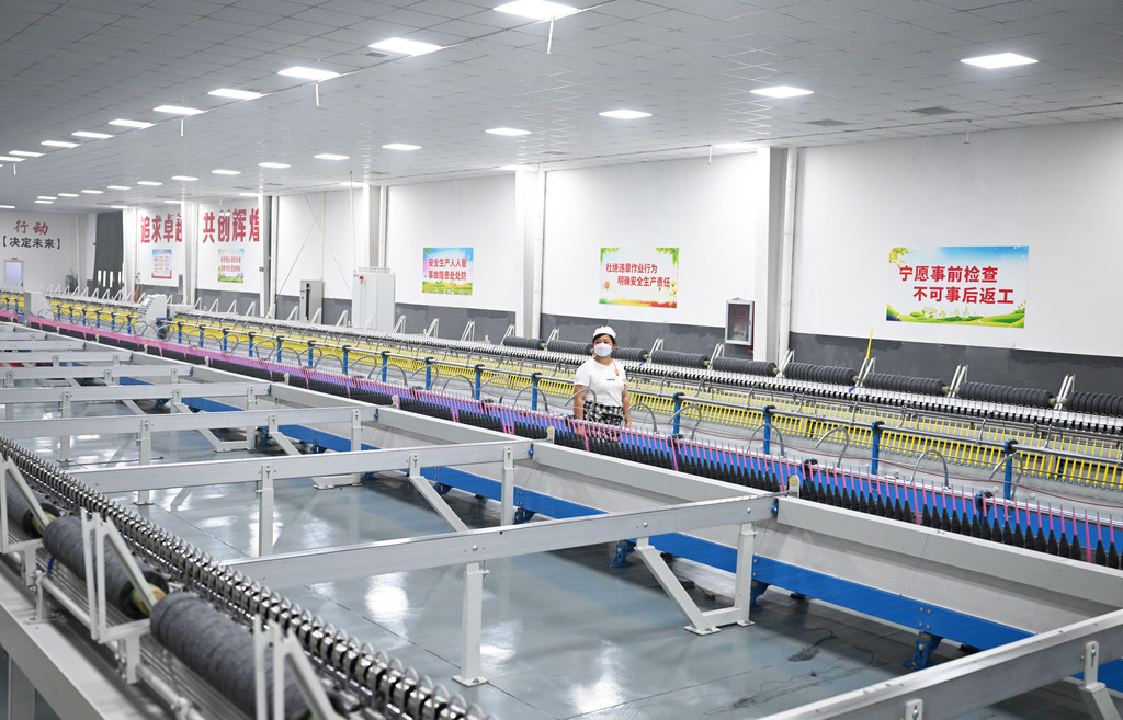 9月28日,位于南宫市段芦头镇的河北万沛羊绒制品有限公司员工在纱线车间巡检。