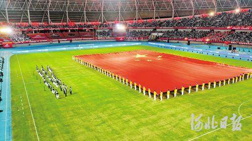 10月2日晚,在“郸青超”闭幕式现场,志愿者们展开巨幅国旗,表达对伟大祖国的美好祝愿。董源摄