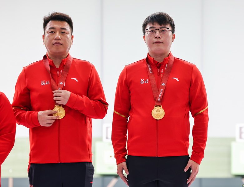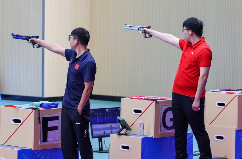 10月15日,牛琪松(右)在男子10米气手枪决赛中。