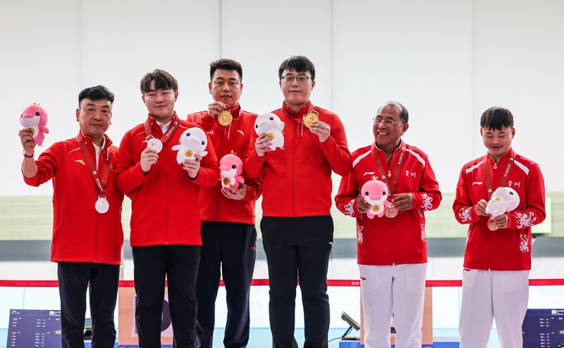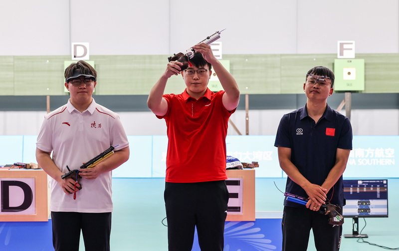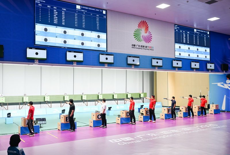 10月15日,第十五届全运会射击男子10米气手枪决赛现场。
