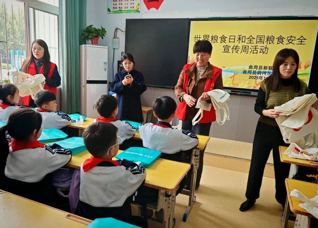 10月15日,在第45个世界粮食日到来之际,为进一步弘扬勤俭节约的传统美德,河北省邯郸市曲周县新的社会阶层人士联合会(以下简称新联会)组织会员代表走进前河东小学,以“粮食节约,人人有责”为主题开展宣传活动,让爱粮节粮的种子在孩子们心中生根发芽。