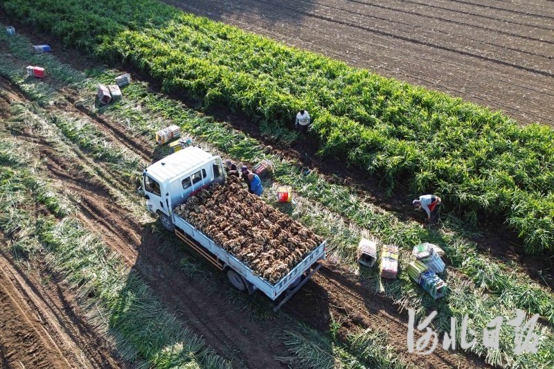 10月16日,河北省玉田县窝洛沽镇东贾庄村的生姜喜获丰收,姜农们抢抓晴好天气加紧收获、外运,田间一片忙碌景象。