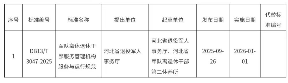 近日,河北省市场监督管理局发布通告,发布《军队离休退休干部服务管理机构服务与运行规范》河北省地方标准。通告称,按照《京津冀区域共同制定地方标准有关事项的会议纪要》要求,经河北省市场监督管理局批准,《军队离休退休干部服务管理机构服务与运行规范》省地方标准作为京津冀协同地方标准发布。