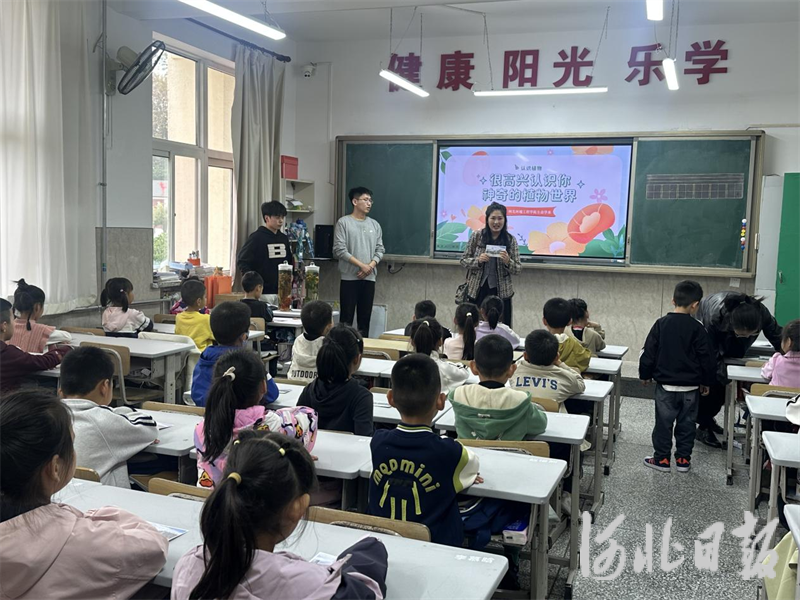 活动伊始,北戴河区实验小学党总支书记王素艳与河北环境工程学院生态学系党总支书记郑习龙签署党建共建协议,明确双方在资源共享、科普教育、实践育人等方面的合作方向,为后续深度联动奠定坚实基础。仪式后,科普活动分学段同步开展。在低年级课堂,河北环境工程学院的学生党员以“身边的植物朋友”为主题,通过实物展示、趣味问答等形式,带领孩子们认识植物结构、了解生态作用,激发孩子们对大自然的好奇与热爱;在中年级课堂,河北环境工程学院的学生党员结合生动案例讲述核科技发展历程与科研工作者的奉献故事,引导学生厚植家国情怀,树立远大理想。