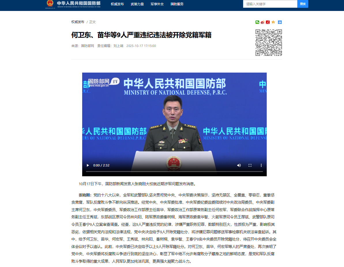 张晓刚:党的十八大以来,全军和武警部队坚决贯彻党中央、中央军委决策指示,坚持无禁区、全覆盖、零容忍,重拳惩贪肃腐,军队反腐败斗争不断向纵深推进。经党中央、中央军委批准,中央军委纪委监委陆续对中央政治局委员、中央军委副主席何卫东,中央军委委员、军委政治工作部原主任苗华,军委政治工作部原常务副主任何宏军,军委联合作战指挥中心原常务副主任王秀斌,东部战区原司令员林向阳、陆军原政委秦树桐、海军原政委袁华智、火箭军原司令员王厚斌、武警部队原司令员王春宁9人立案审查调查。经查,这9人严重违反党的纪律,涉嫌严重职务犯罪,数额特别巨大,性质极为严重,影响极其恶劣,依据相关党内法规和法律法规,党中央决定给予9人开除党籍处分,将涉嫌犯罪问题移送军事检察机关依法审查起诉。其中,给予何卫东、苗华、何宏军、王秀斌、林向阳、秦树桐、袁华智、王春宁8名中央委员开除党籍处分,待召开中央委员会全体会议时予以追认。此前,中央军委已决定给予以上9人开除军籍处分。对何卫东、苗华、何宏军等人的严肃查处,再次表明了党中央、中央军委将反腐败斗争进行到底的坚定决心,彰显了军中绝不允许有腐败分子藏身之地的鲜明态度,是党和军队反腐败斗争取得的重大成果,人民军队更加纯洁巩固、更具强大凝聚力战斗力。