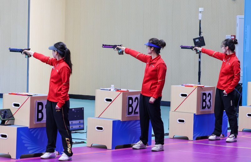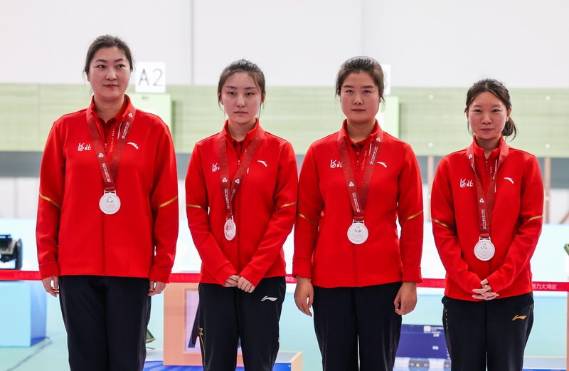 10月17日,河北队靳博涵、王一荻、祖鹏雯(左至右)在女子10米气手枪团体决赛中。