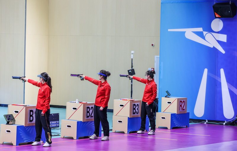 10月17日,第十五届全国运动会射击女子10米气手枪团体决赛现场。
