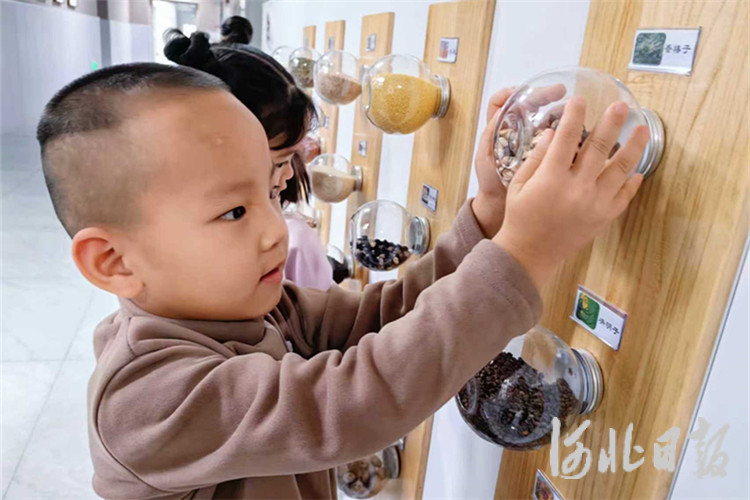 10月16日,石家庄市新华区第一幼儿园老师教小班幼儿认识各种粮食种子,了解粮食生长过程。