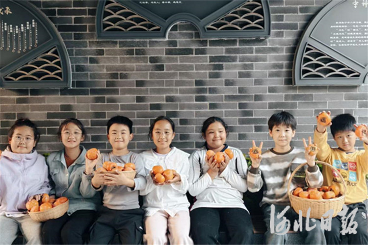 10月15日,石家庄市宁安路小学学生展示在校园内采摘的成熟柿子,体会丰收喜悦。