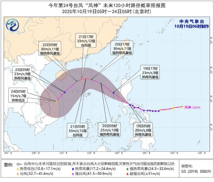预计,“风神”将以每小时30-35公里的速度向西北方向移动,今天傍晚前后进入南海东部海面,强度逐渐加强,最强可达强热带风暴级或台风级(30-35米/秒,11-12级);21日白天开始受南下冷空气影响,在南海北部海面转向西南方向移动,强度逐渐减弱。
