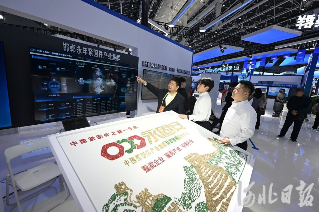 10月19日,2025中国国际数字经济博览会展区,工作人员向参观者介绍中国(永年)紧固件工业互联网平台。河北日报记者 史晟全摄
