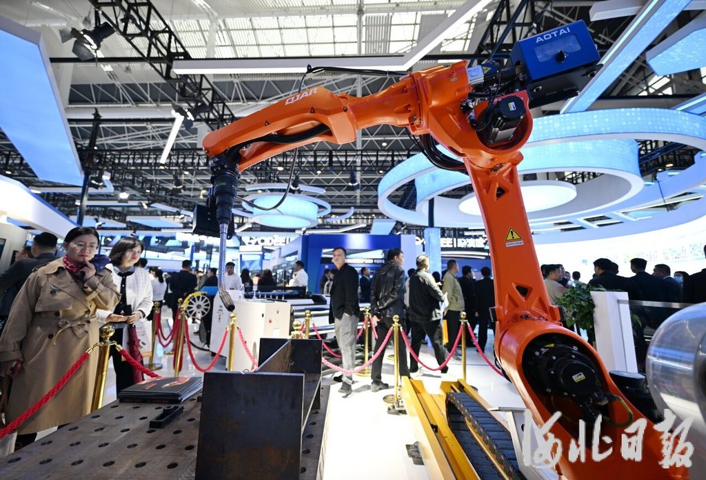 10月17日,观众在2025中国国际数字经济博览会展区参观工业机器人。河北日报记者 史晟全摄