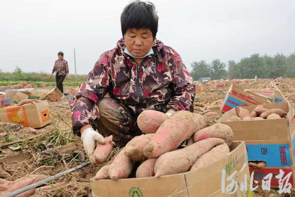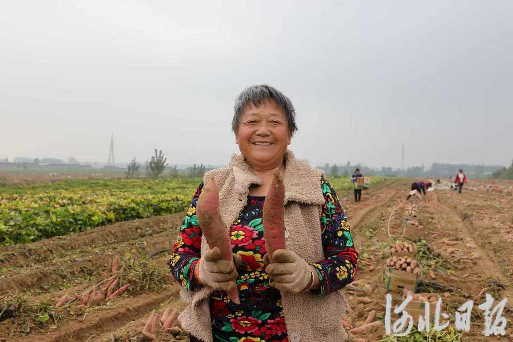 广宗县七斗店村红薯田,村民拿着收获的红薯喜笑颜开。