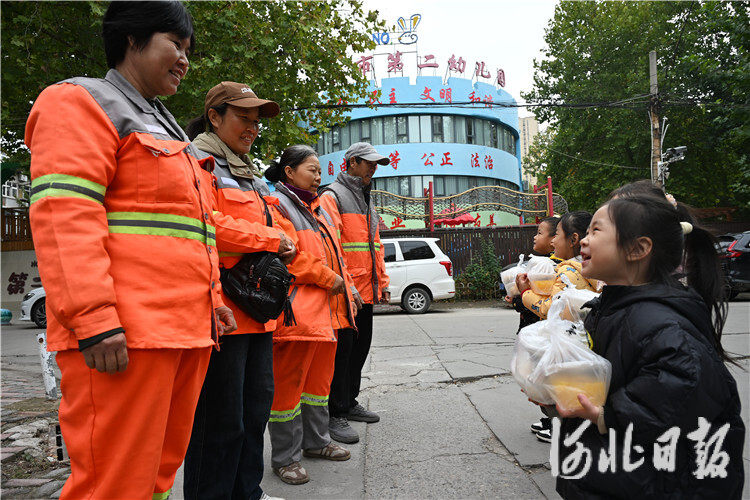 10月21日,石家庄市第二幼儿园的小朋友们为环卫工人送上自己制作的爱心餐。
