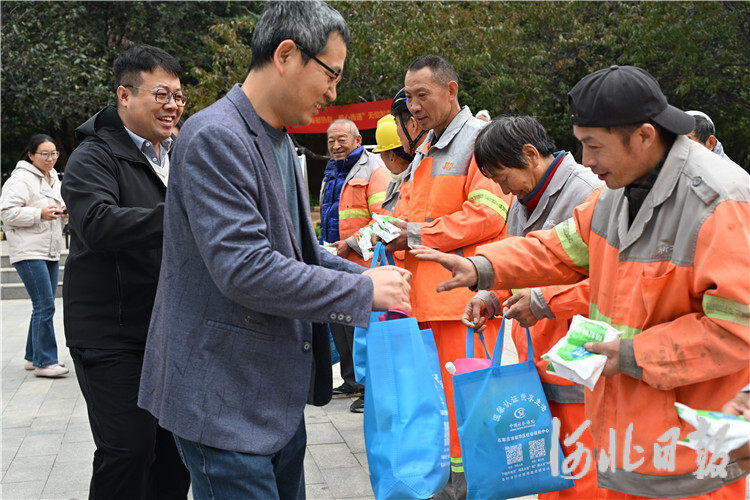 10月20日,在“关爱环卫工情暖环卫节”公益活动中,石家庄市新华区委社工部及爱心企业代表向环卫工人分发爱心保鲜盒。
