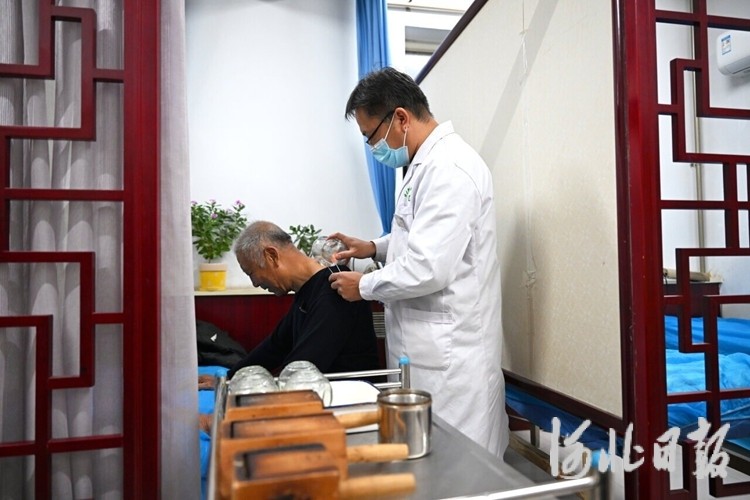 10月21日,邢台市襄都区西大街社区卫生服务中心泉城扁鹊堂,副主任医师刘步岗在为患者进行拔罐治疗。河北日报、河北日报客户端记者赵永辉摄