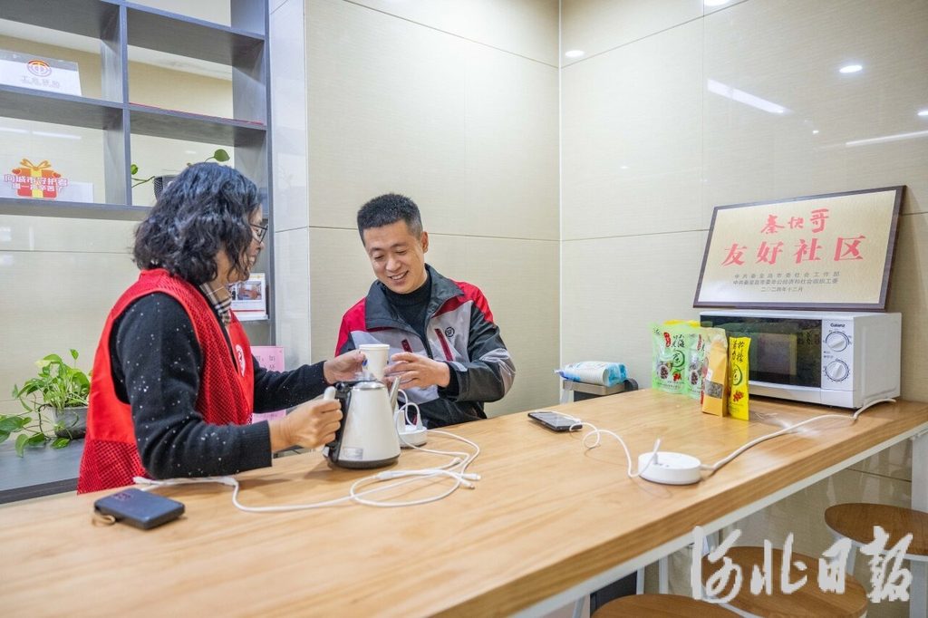 10月18日,刘行(右)在秦皇岛市海港区文化路街道人民里社区暖“新”驿站休息。河北日报记者赵杰摄