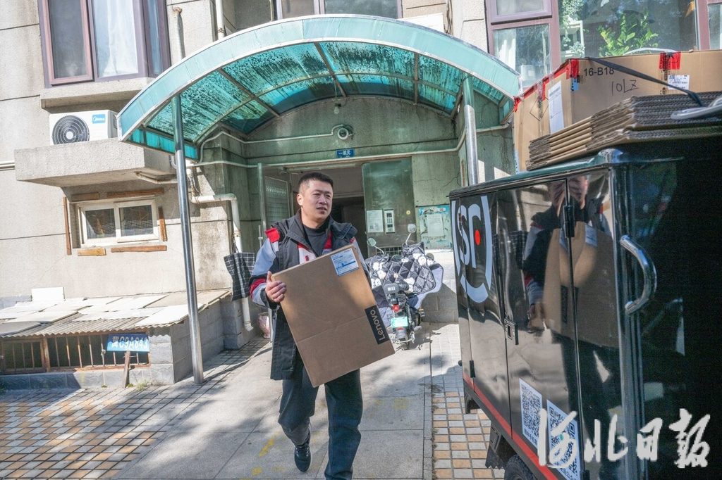 10月18日,刘行在秦皇岛市海港区锦绣嘉园小区收取快递件。河北日报记者赵杰摄