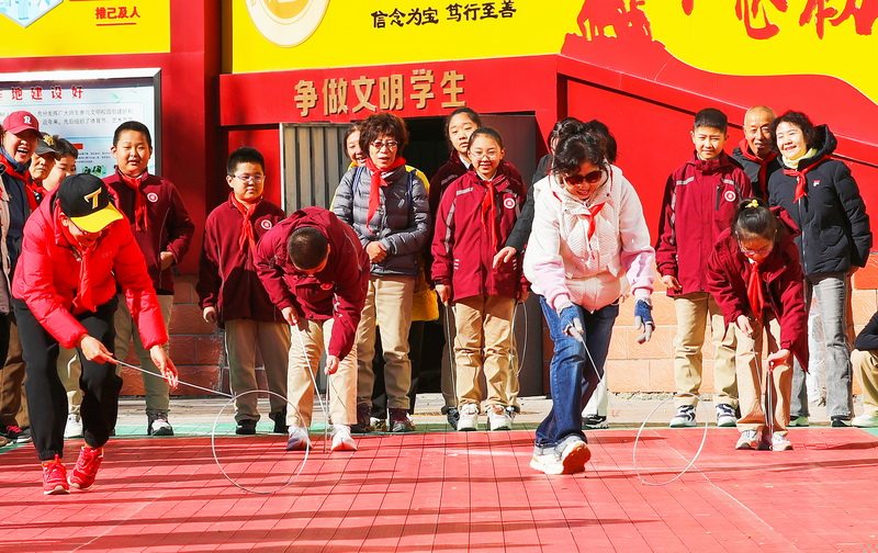 10月27日,张家口市桥东区工业路街道菜园街社区、光明街社区居民与桥东区宝善街小学学生比赛滚铁环。