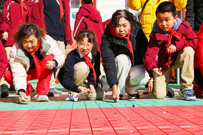 10月27日,张家口市桥东区工业路街道菜园街社区、光明街社区居民与桥东区宝善街小学学生一起弹玻璃球。
