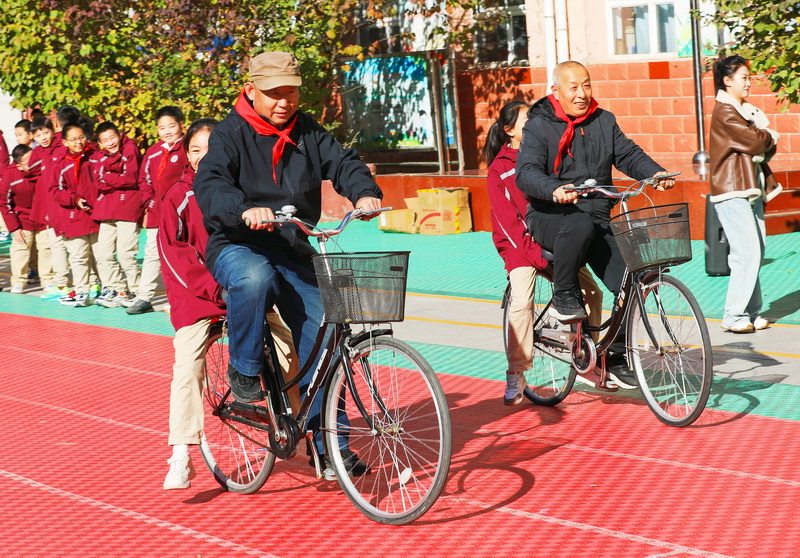 10月27日,张家口市桥东区工业路街道菜园街社区、光明街社区居民与桥东区宝善街小学学生比赛骑自行车。