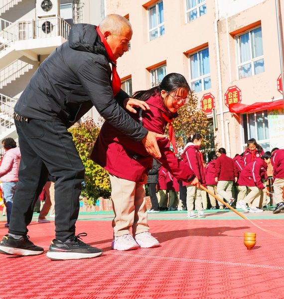 10月27日,张家口市桥东区工业路街道菜园街社区、光明街社区居民与桥东区宝善街小学学生一起抽陀螺。