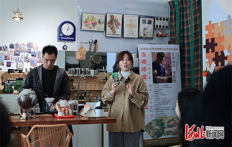 10月26日,在石家庄Serendipity's即至咖啡馆,咖啡主理人曾榕正在讲解手冲咖啡知识。