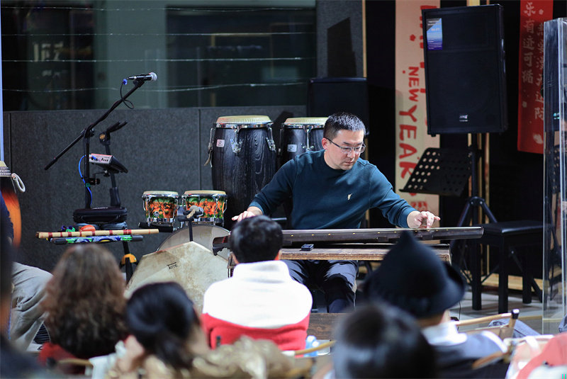 10月21日晚,在石家庄地平线摇滚俱乐部,古韵龙吟·铭鲲琴院音乐教师窦泽佳正在演奏古琴乐曲。