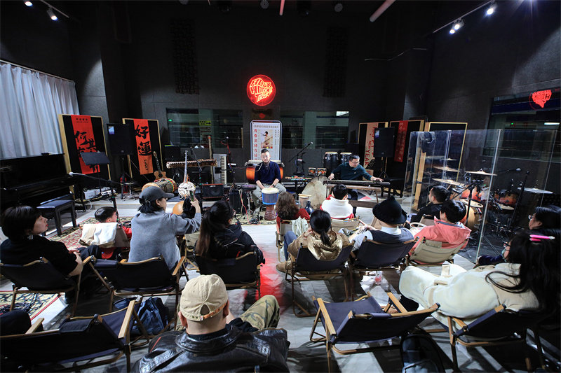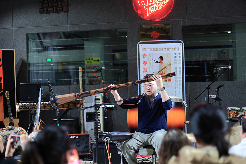 10月21日晚,在石家庄地平线摇滚俱乐部,大思政·青年夜校流行音乐课程正在进行。