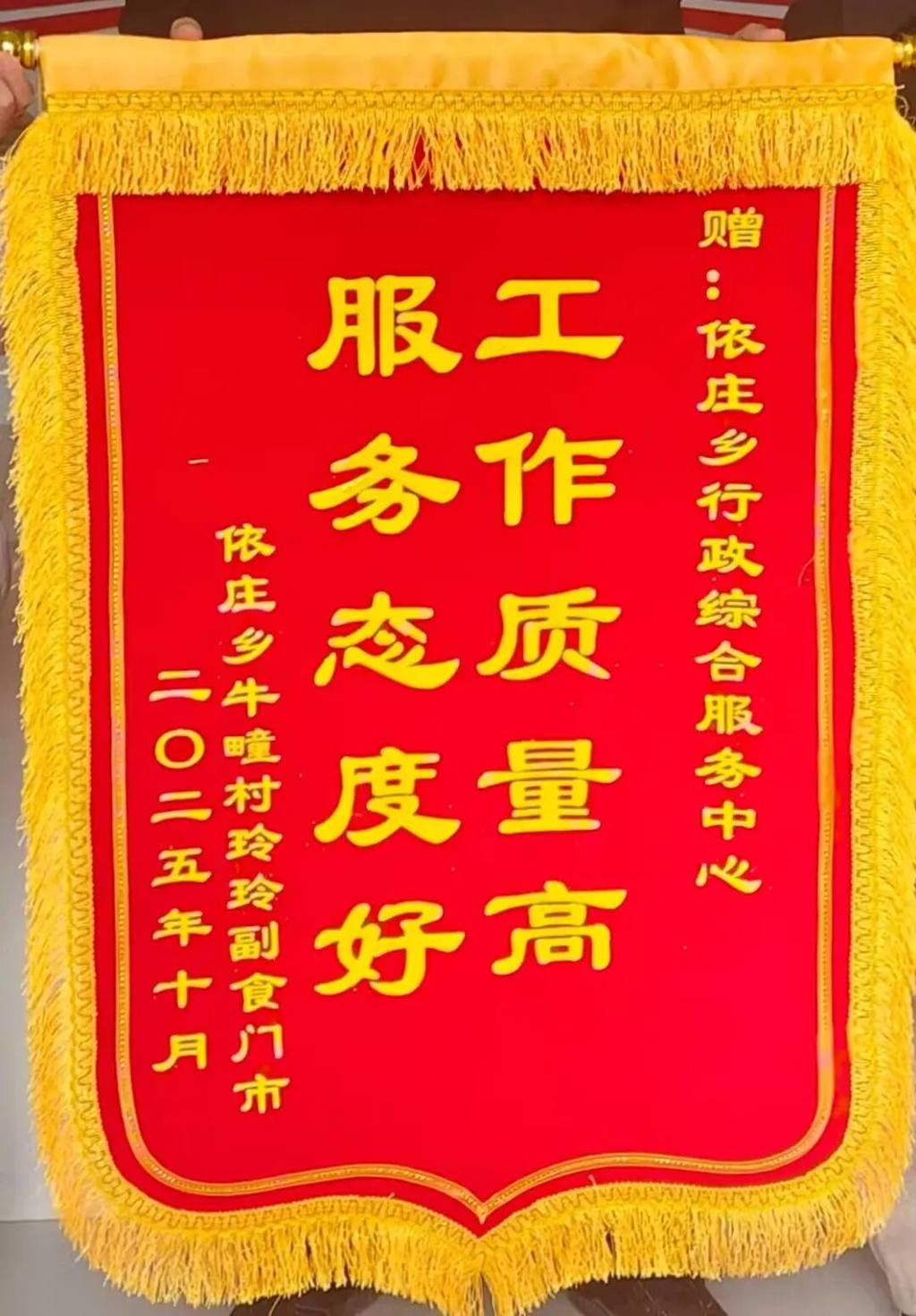 10月27日,河北省邯郸市曲周县依庄乡牛疃村玲玲副食门市负责人将一面写有“工作质量高 服务态度好”字样的锦旗送到了依庄乡综合服务中心工作人员手中,以此表达对中心工作人员耐心周到、高效便捷服务的诚挚感谢。