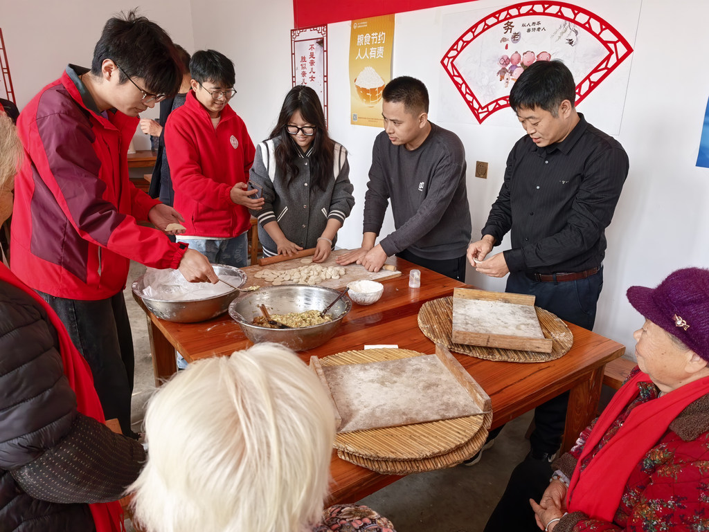 10月29日,曲周白寨科技小院学生与村镇干部在马布幸福院为老人筹备“爱心饺子宴”。
