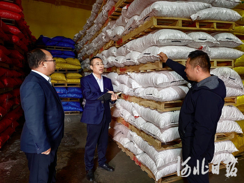 10月24日,遵化市农村信用合作联社工作人员到遵化市庞储食品有限公司回访,与企业负责人(右一)一同查看板栗储存状况。河北日报记者王育民摄
