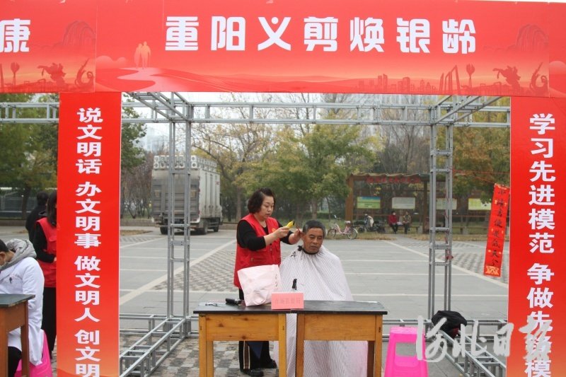 活动在志愿者对重阳节起源与民俗内涵的介绍中拉开序幕,随后,志愿者代表宣读了孝老爱亲倡议书,号召全社会践行尊老敬老美德,传递社会正能量。义诊护安康、义剪焕银龄、书法送福泽等文明实践活动同步展开,营造出浓厚的节日氛围。